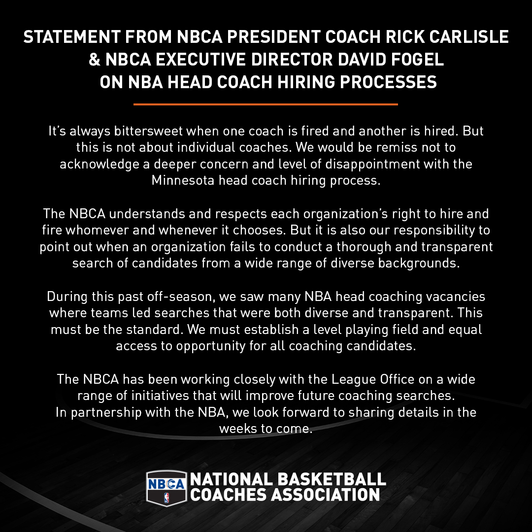 Statement from NBCA President Coach Rick Carlisle & NBCA Executive Director David Fogel on NBA Head Coach Hiring Processes