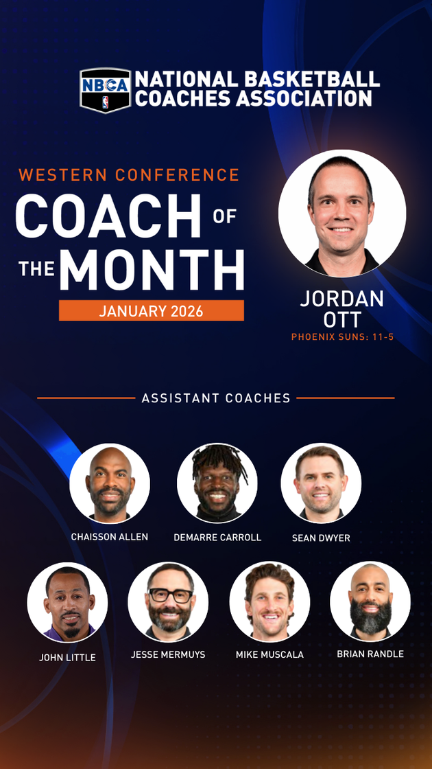 Western Conference Coach of the Month, Jordan Ott, led the Phoenix Suns to a 11-5 record in January 2026.