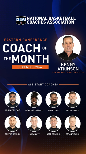 Eastern Conference Coach of the Month, Kenny Atkinson, led the Cleveland Cavaliers to a 12-1 record in December 2024. This