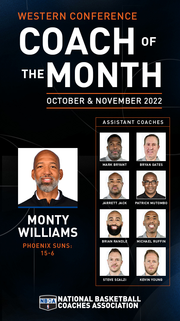 Western Conference Coach of the Month Monty Williams led the Phoenix Suns to a 15-6 record in Oct/Nov. During this period, the Suns averaged 115.8 points, 7.4 steals and 5.9 blocks per game. Congrats to